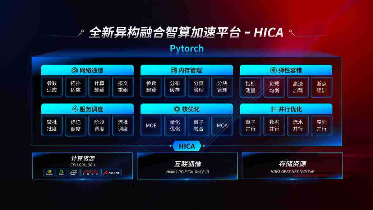 通过自研的服务层、、、中间适配层、、、以及调度编排算法,,采用数据并行、、、、模型并行等多种并行方式,,,把并行计算任务进行有效的分解,,使其分别由相应的软件栈和算力资源来承接。。。当GPU资源变化,,HICA可以实时动态调度计算子任务并调整模型拓扑和架构,,以充分聚合各种算力资源。。。。